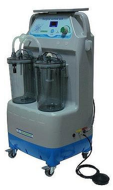 Surgical and Gynaecology Mobile Suction Unit with handle, ABS tray, storage box and 4 castors with 4 lockable castors, Main construction: Cast aluminium and ABS, Plastic bottle: 2pcs x 3,000c.c. graduated at 250c.c. autoclavable at 130°C plastic bottle with silicone rubber seal and handle, Max. suction: -10~-720 mm/Hg, Select valve: Suction and extraction, Vacuum control: Needle valve, Vacuum indicator: 0~-760 mm/Hg graduated at -10 mm/Hg Digital LED indicator, Vacuum flow: 0~80 liter/min, Max. HP: 250W 1/3HP,