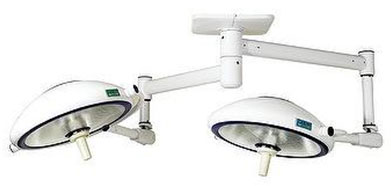 Ceiling Mounted Surgical Lamp, Main construction: Cast aluminium and powder coated steel, Dual dome surgical lamp 62cm + 62cm, Reflector: 50cm aluminium 160 layers reflector and 8pcs filter, Lamp head cover: 4,760 lenses / transparent lenses polycarbonate reflector, Bulb specifications: OSRAM 24V 150W x 6pcs (1 primary and 2 backup X 2sets), Working distance: 60~180cm, Depth of light (L1+L2): 120cm, Intensity (1meter): 0~80,000/100,000/150,000 Lux/1m, Focus (1meter): 15~25cm by sterilizable handle,