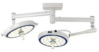 Ceiling Mounted LED Surgical Lamp, Main construction: Cast aluminium and powder coated steel, Lamp head: Dual dome LED surgical lamp 62cm + 62cm, Reflector: 6cm aluminium reflector x 36pcs, Lamp head cover: 4,760 lenses / transparent lenses polycarbonate reflector, Bulb specifications: LED 1W x 36pcs x 2, Bulb life time: 50,000 hrs ±10%, Working distance: 60~180cm, Depth of light (L1+L2): 120cm, Intensity (1meter): 0~165,000 Lux/1m, Focus (1meter): 15~25cm by sterilizable handle,